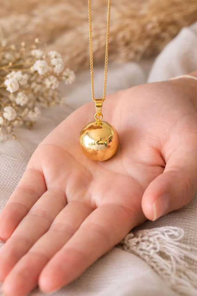 Bola de grossesse en finition doré lisse, cet accessoire délicat accompagne votre grossesse avec élégance. Le doux tintement de la bille crée une mélodie apaisante pour bébé in utero. À porter en collier ou à accrocher au-dessus du berceau après la naissance, cette bola devient un souvenir précieux de votre maternité. Finition dorée brillante pour un style raffiné et intemporel.