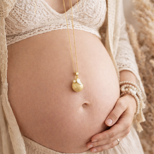Bola de grossesse élégant en finition doré sablé, orné de deux breloques délicates : un soleil étincelant serti de zircons et une lune nacrée. Ce bijou de maternité crée une douce mélodie qui accompagne chaque mouvement, créant un lien sonore unique avec bébé. Parfait comme cadeau de grossesse raffiné, il allie beauté intemporelle et symbolique poétique. À porter en collier ou en bracelet pour profiter de son charme tout au long de la grossesse.