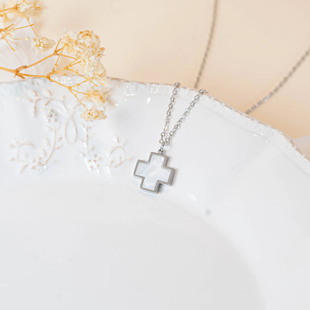Collier croix chrétienne argenté avec pendentif croix nacre en acier inoxydable pour femme