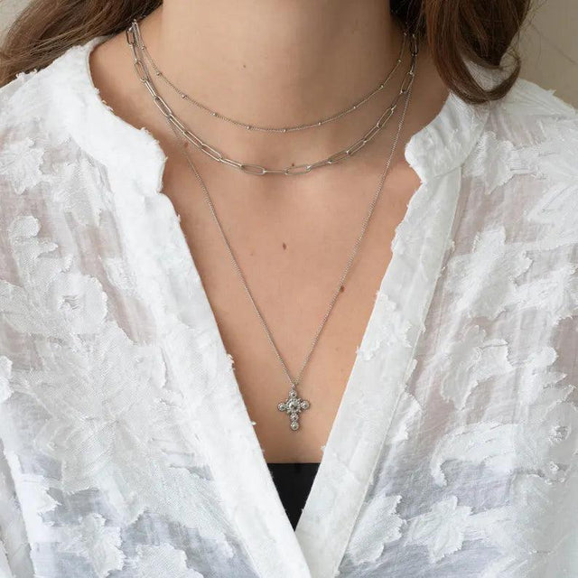 Collier croix chrétienne trois rangs argent acier inoxydable femme