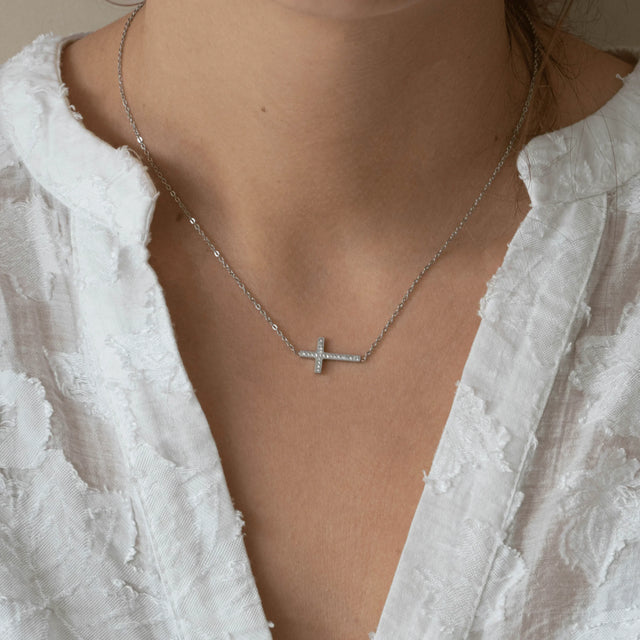 Collier croix horizontale strass ras de cou argent acier inoxydable